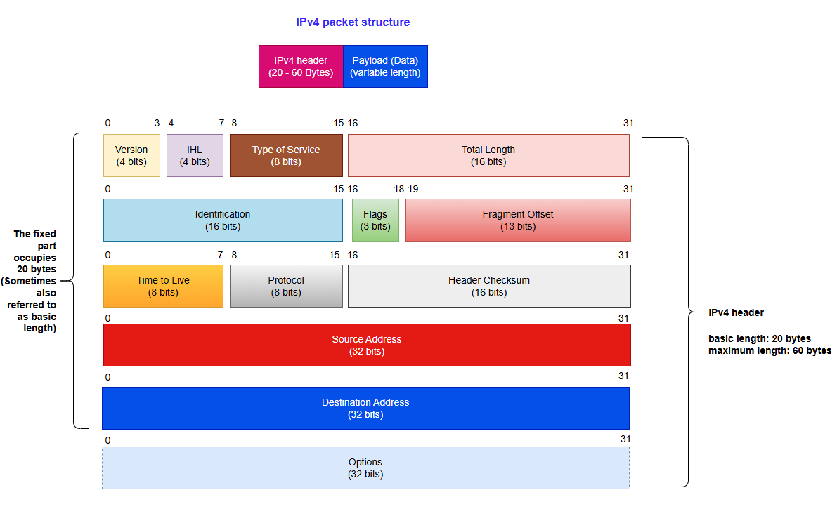 • IPv4‌ - (4 bits,0100)。 IPv4 的可用地址空间为232(从 IPv4 数据包中的源地址和目的地址字段中已知)。 具体分为: