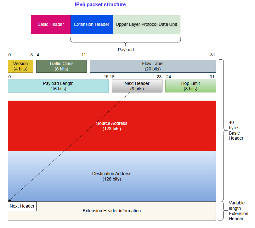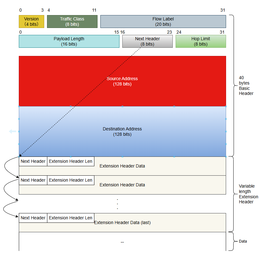 • IPv6 - (4 bits,0110)。 IPv6 的可用数量为2128(从 IPv6 数据包中的源地址和目的地址字段中已知)。 具体分为:
